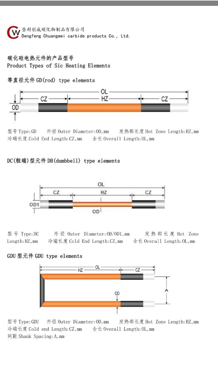12.选用碳化硅电热元件,必须保元件的发热部长度不大于炉膛的宽度。在使用元件时应选用合理的表面负荷,选择此负荷应视元件的使用温度和环境气氛而定。